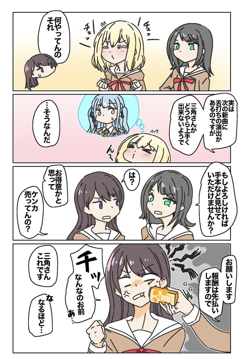「下次的新歌需要咂舌演出,但三角同學怎麼練習都不太成功」「這樣啊」