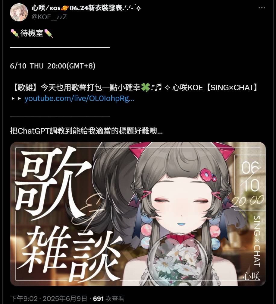 直播已經開始,想聽KOE唱歌的人快來吧