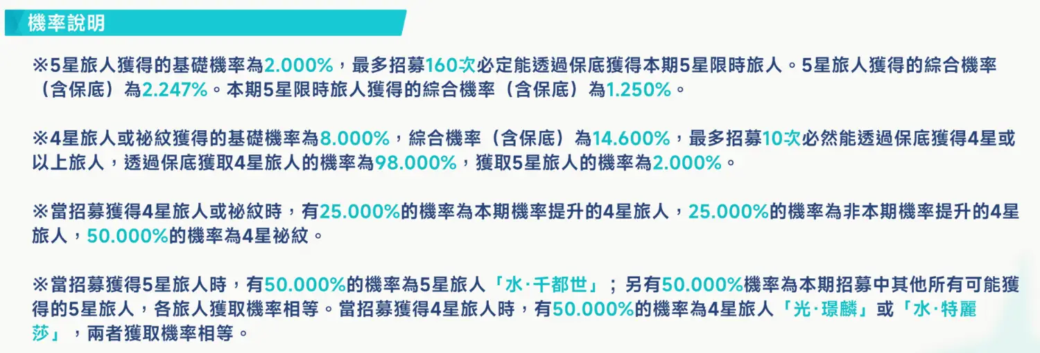 2%,機率不會漸進,50%歪,160抽保底,五星沒有大小保之分