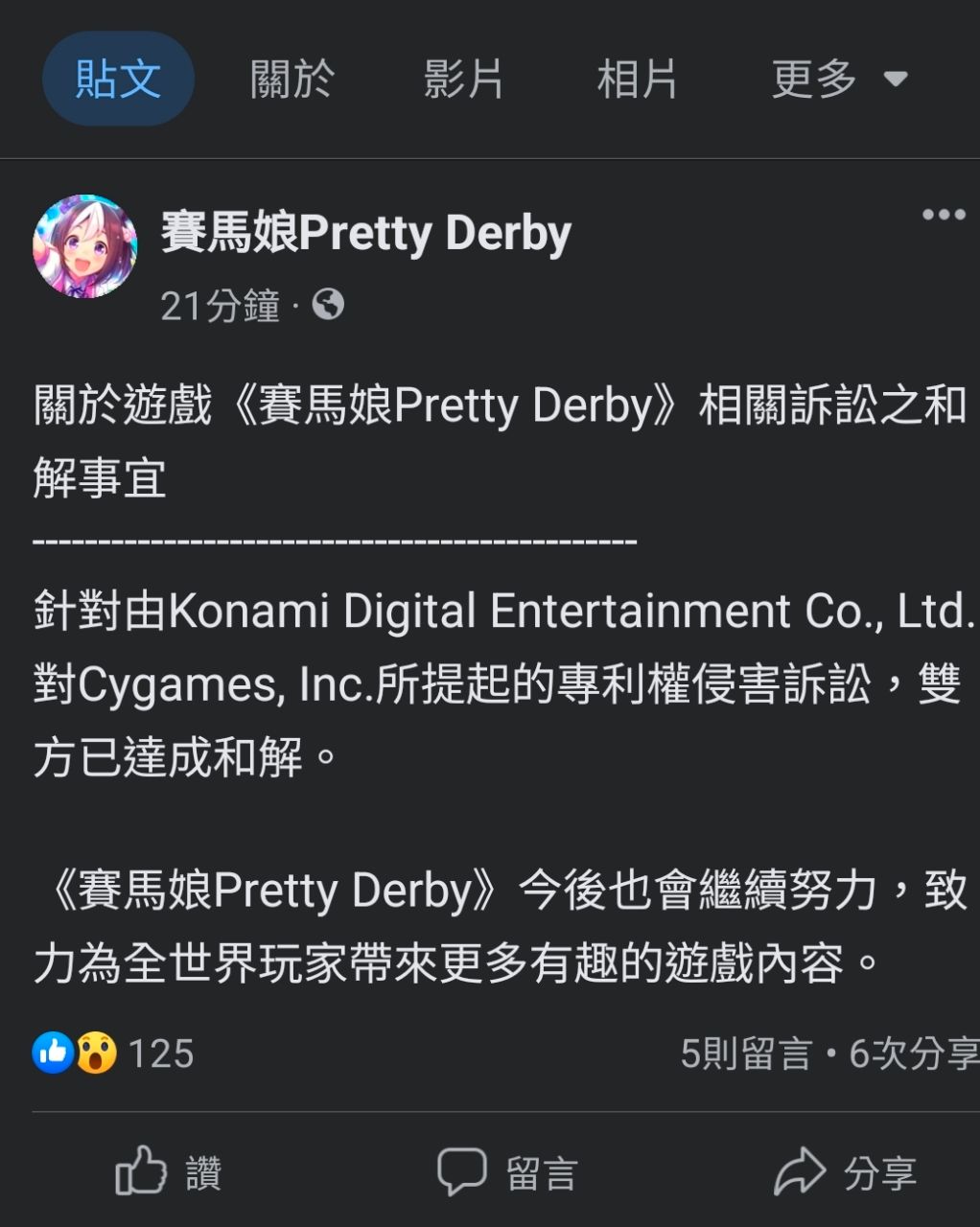 關於遊戲《賽馬娘Pretty Derby》相關訴訟之和解事宜