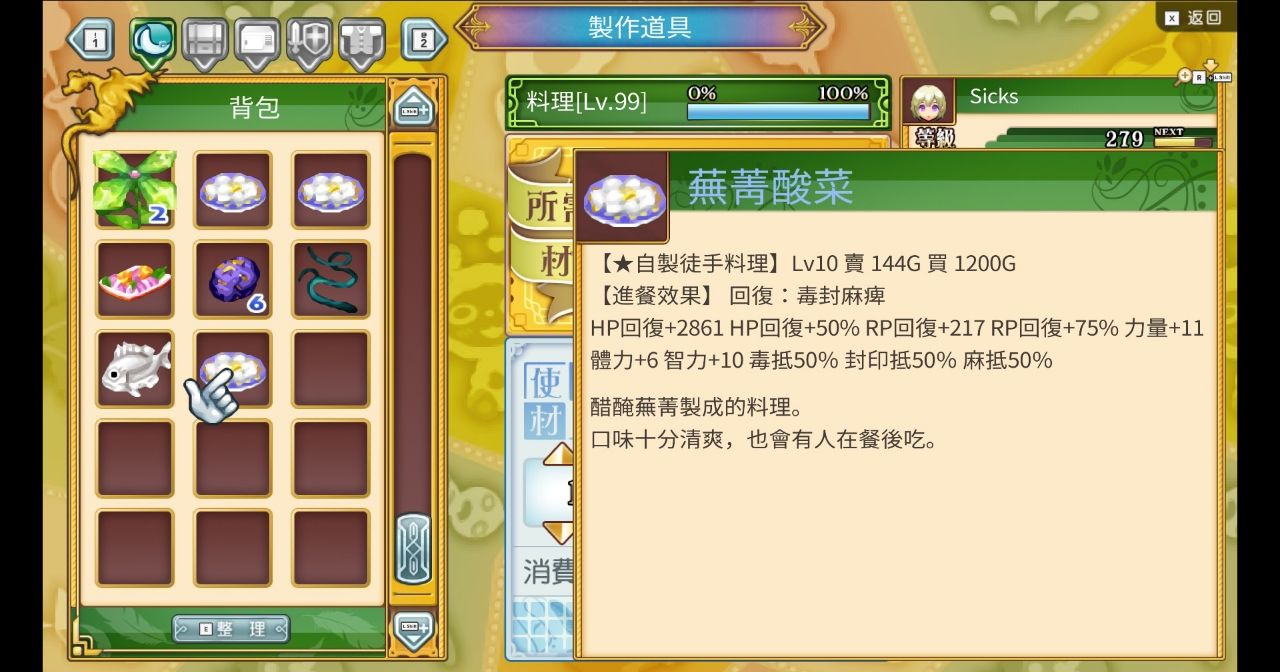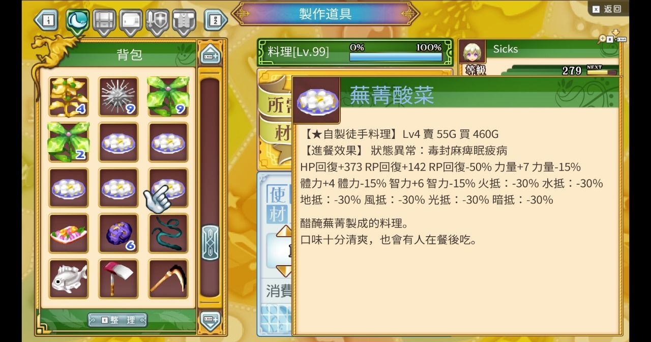 其次是有些藥品雖然會給不錯的Buff,但也會有相應的缺陷,所以視情況丟入料理整合會