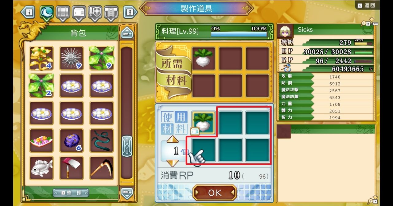 符文的料理系統其實很簡單,素材至多6個,原素材以外的所有空格都是你能拿來客製的