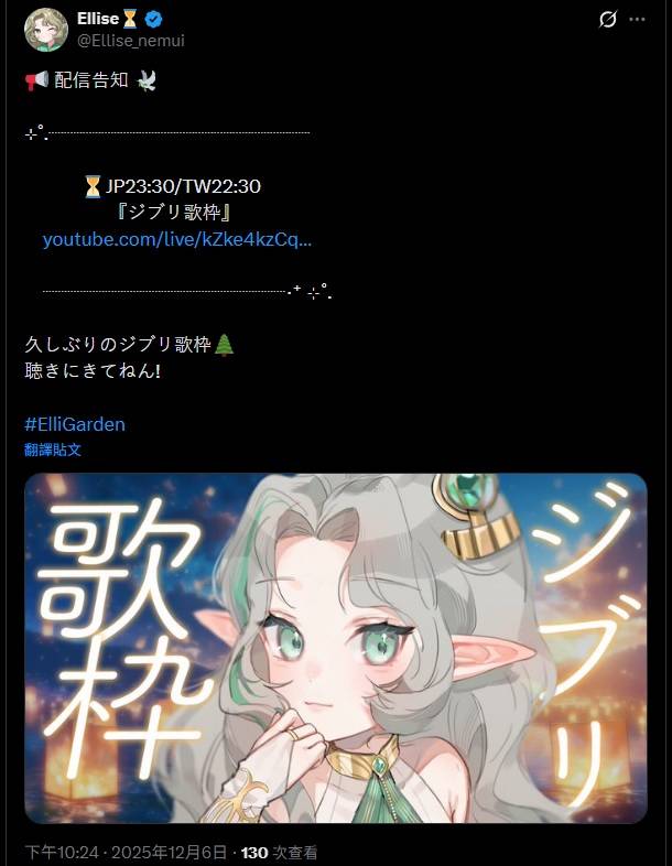 直播已經開始,想聽吉卜力歌曲或是想聽Ellise唱歌的人都快來吧