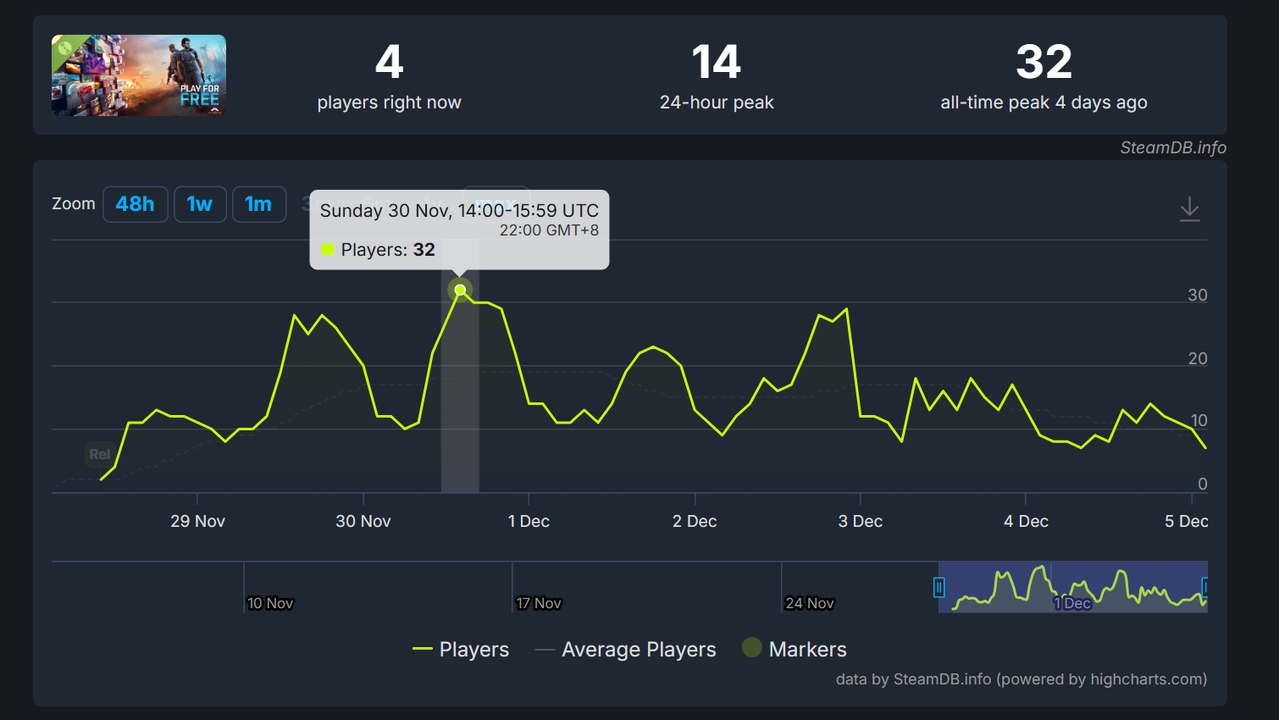 官方雖於 11 月推出免費版,但成效慘烈,Steam 最高同上僅 32 人。