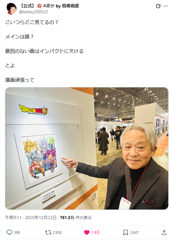 鳥嶋和彥對著Jump Festa展示的《七龍珠超》原畫發文表示:「這些角色在看哪裡?主角