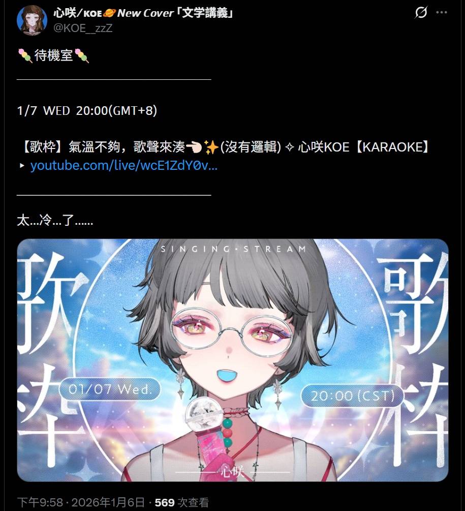直播已經開始,想聽KOE唱歌湊溫度(?)的人快來吧