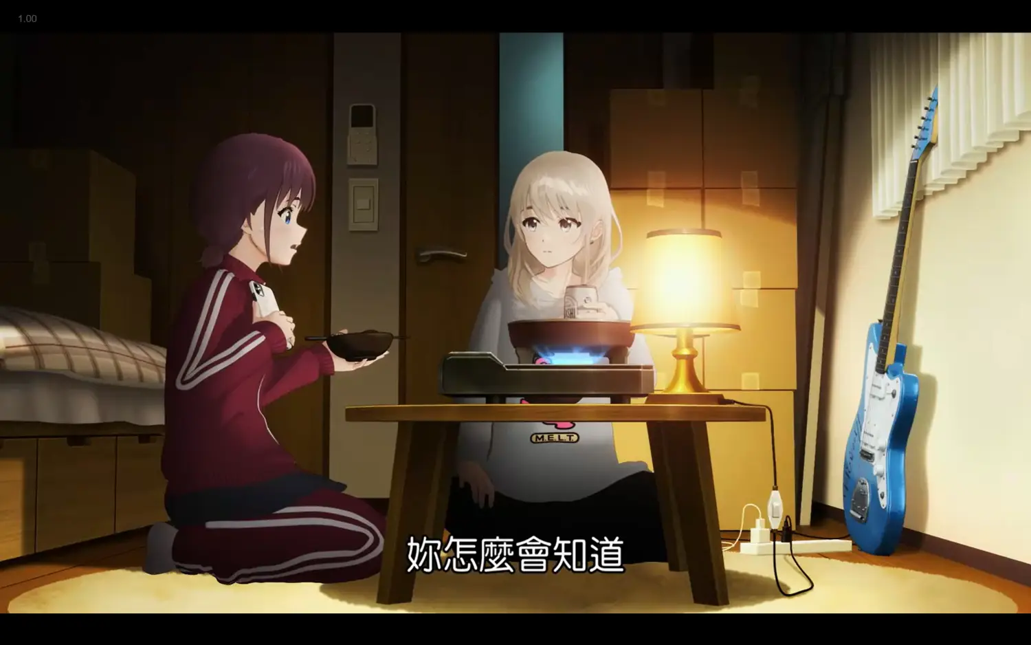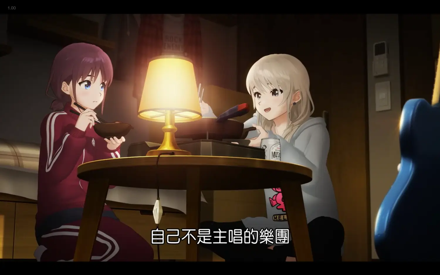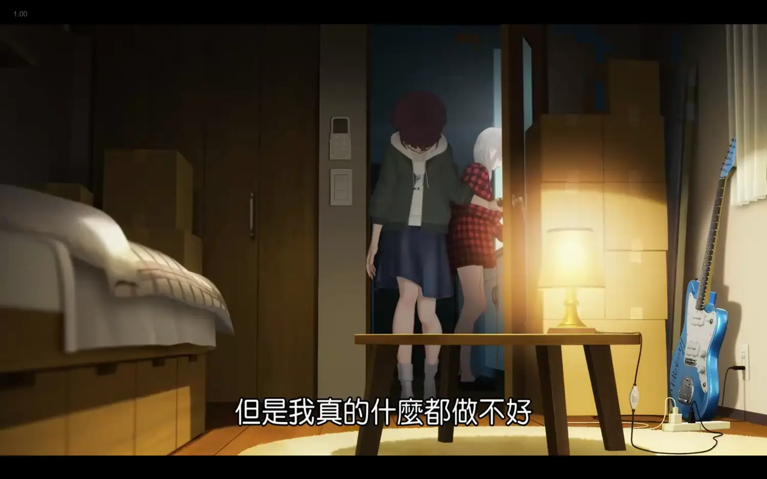 沉浸在孤獨的回憶中,於是摸摸卡、檯燈、吉他都被擋住。