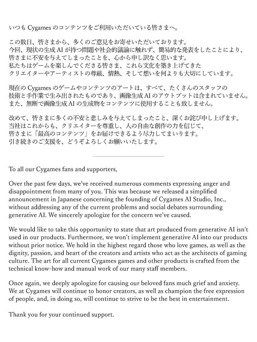再次為造成大家諸多的不安與悲傷,致上最深的歉意。 本公司今後也將尊重創作者,相信