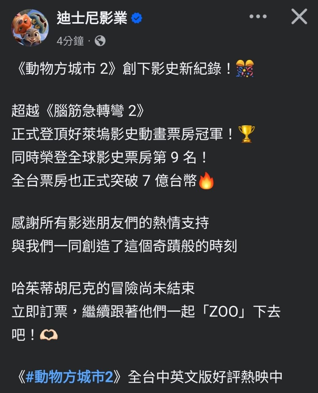 Re: [情報] 《動物方城市2》全台票房突破7億