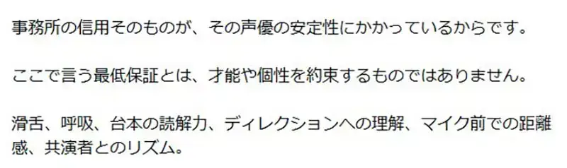 就是經紀公司送聲優去工作的時候,必須保證這個人『演技有達到一定的水準』,這算是