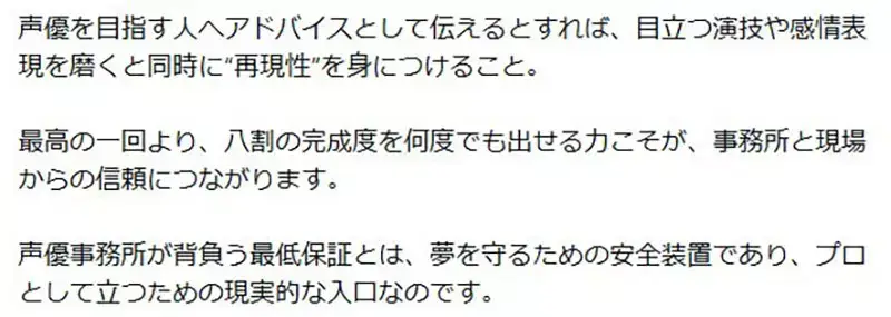 「『重現性』很大程度取決於經驗的累積,因此便形成了資深聲優很容易持續贏得信任的