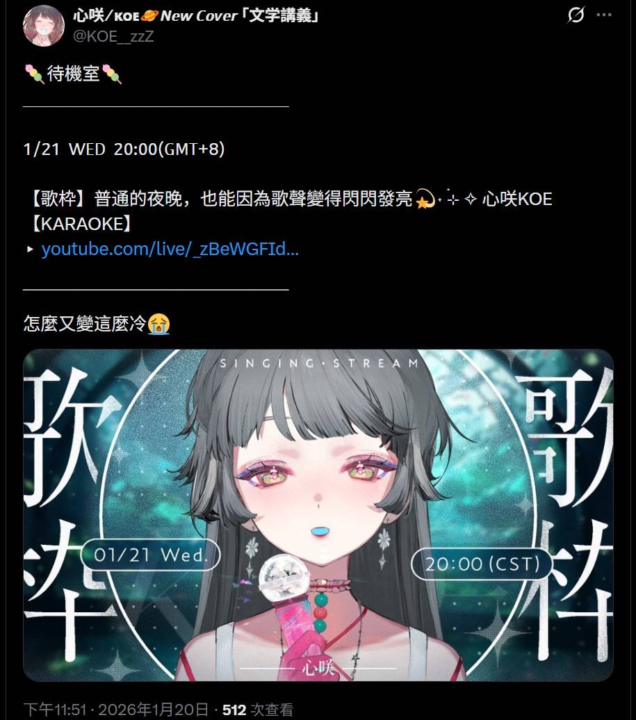 直播已經開始,想聽KOE唱歌的人快來吧