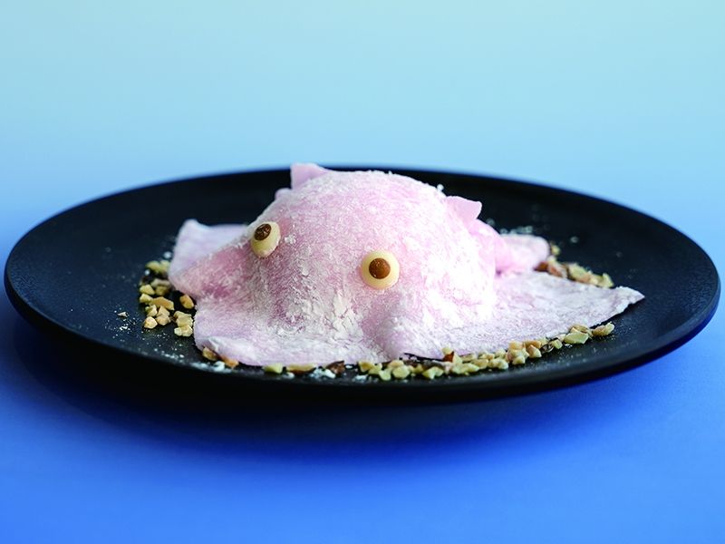 別添えの黒蜜をかける、深海生物で人気のメンダコをイメージしたデザート「メンダコ