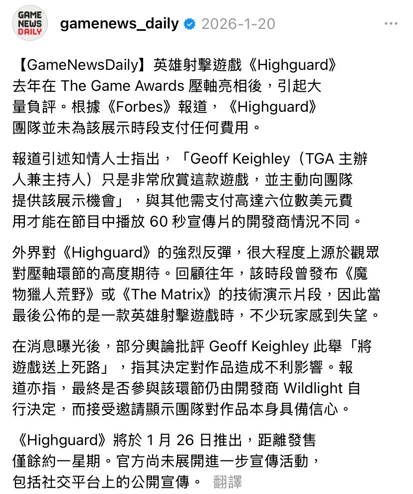 [新聞] TGA壓軸成笑話!《高嶺鐵衛Highguard》