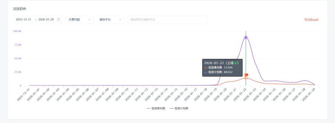 均計劃投放素材在5萬左右,上線當日飆到近9萬,投放的平台也非常之廣泛。線下,上海