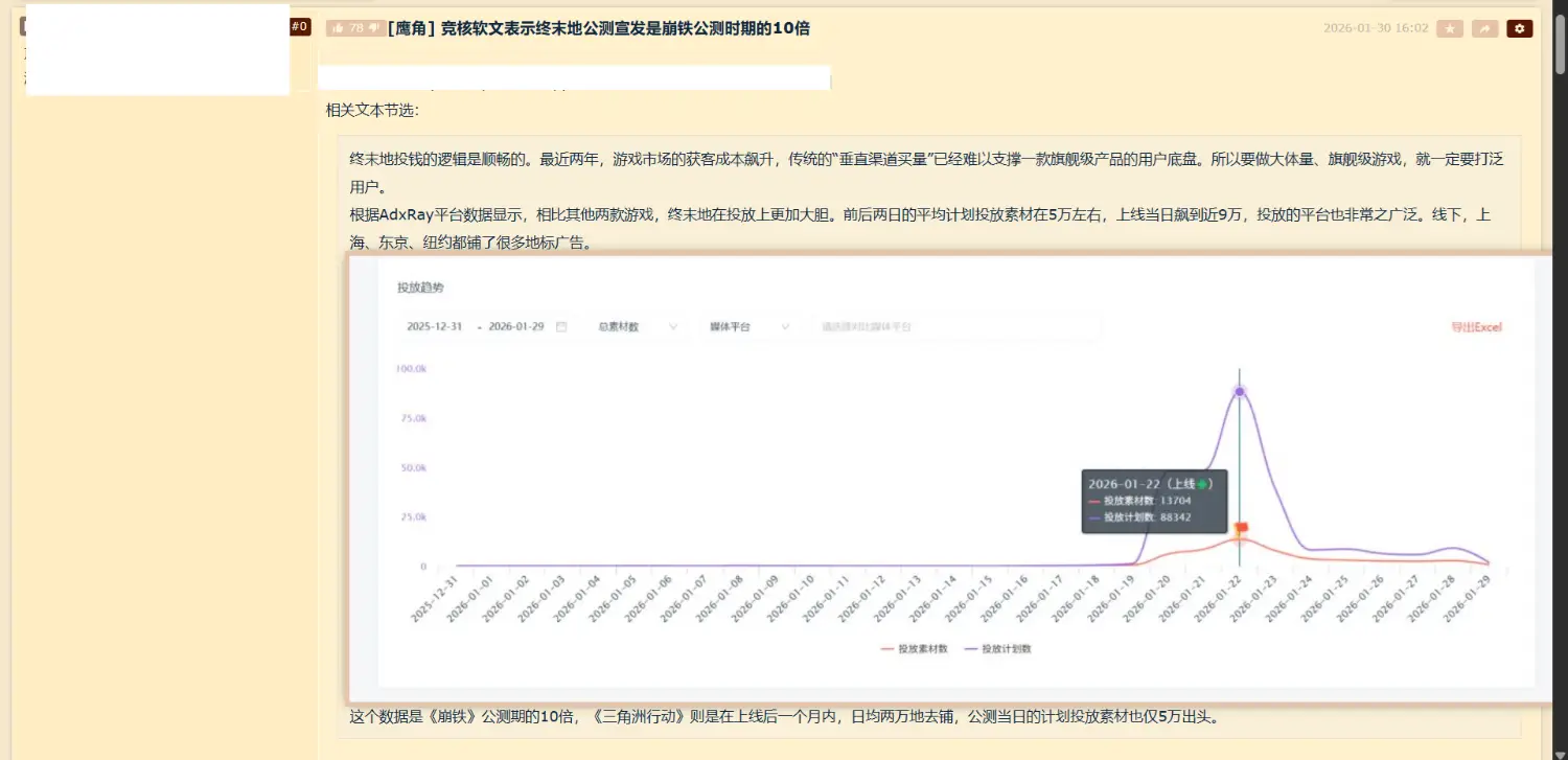 根據AdxRay平台數據顯示,相比其他兩款遊戲,終末地在投放上更加大膽。前後兩日的平