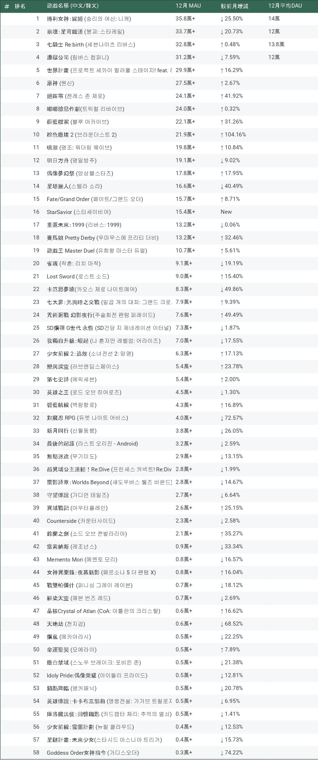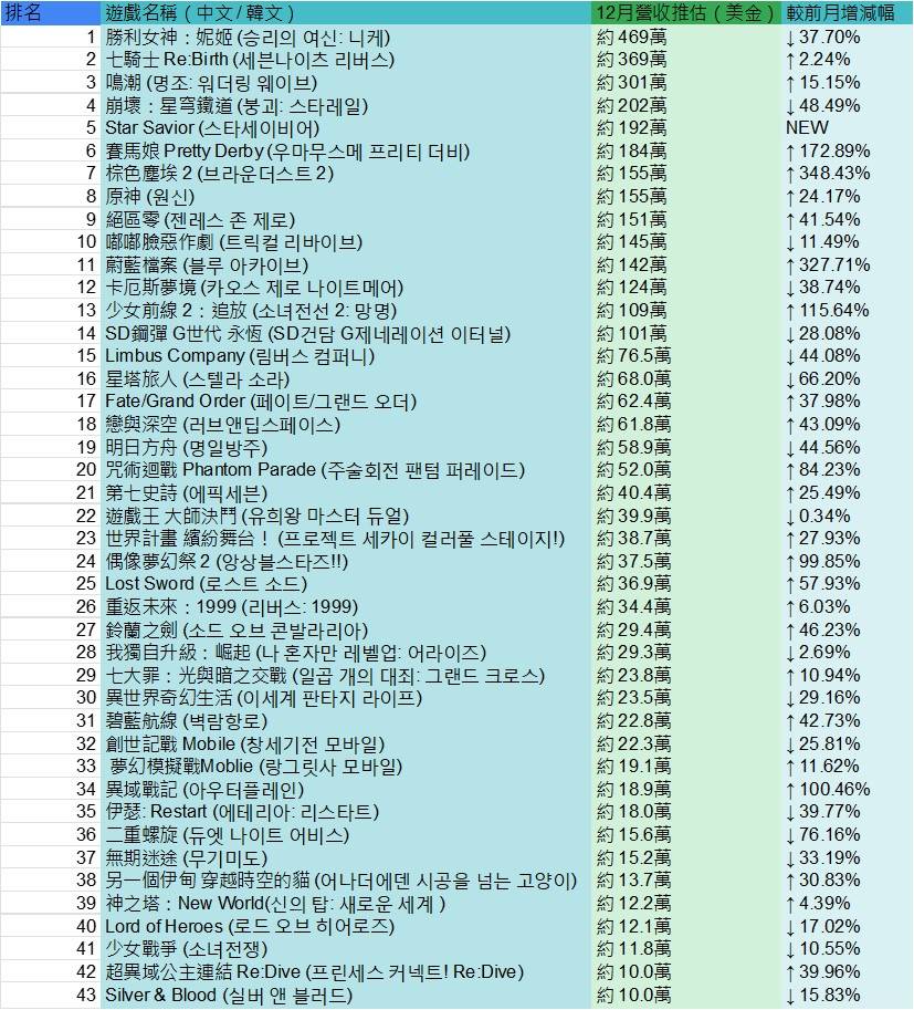 [情報] 韓國地區 次文化手遊12月玩家數&營收