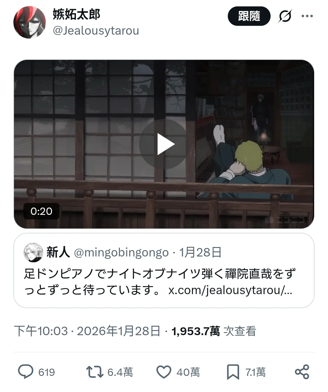 [閒聊] 直哉彈鋼琴 推特讚數40萬了