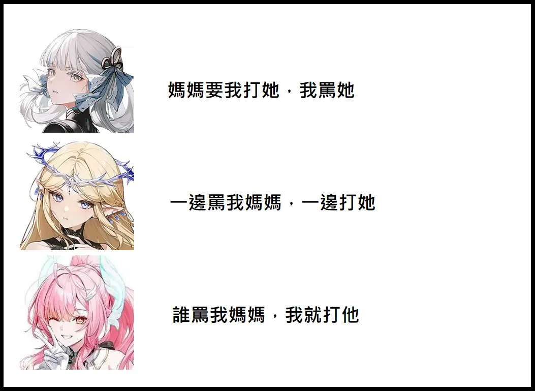 魚媽: 我的女兒在叛逆期,妳們兩個的女兒也在叛逆期 可見我們三個媽媽應該沒有任何差別吧? --