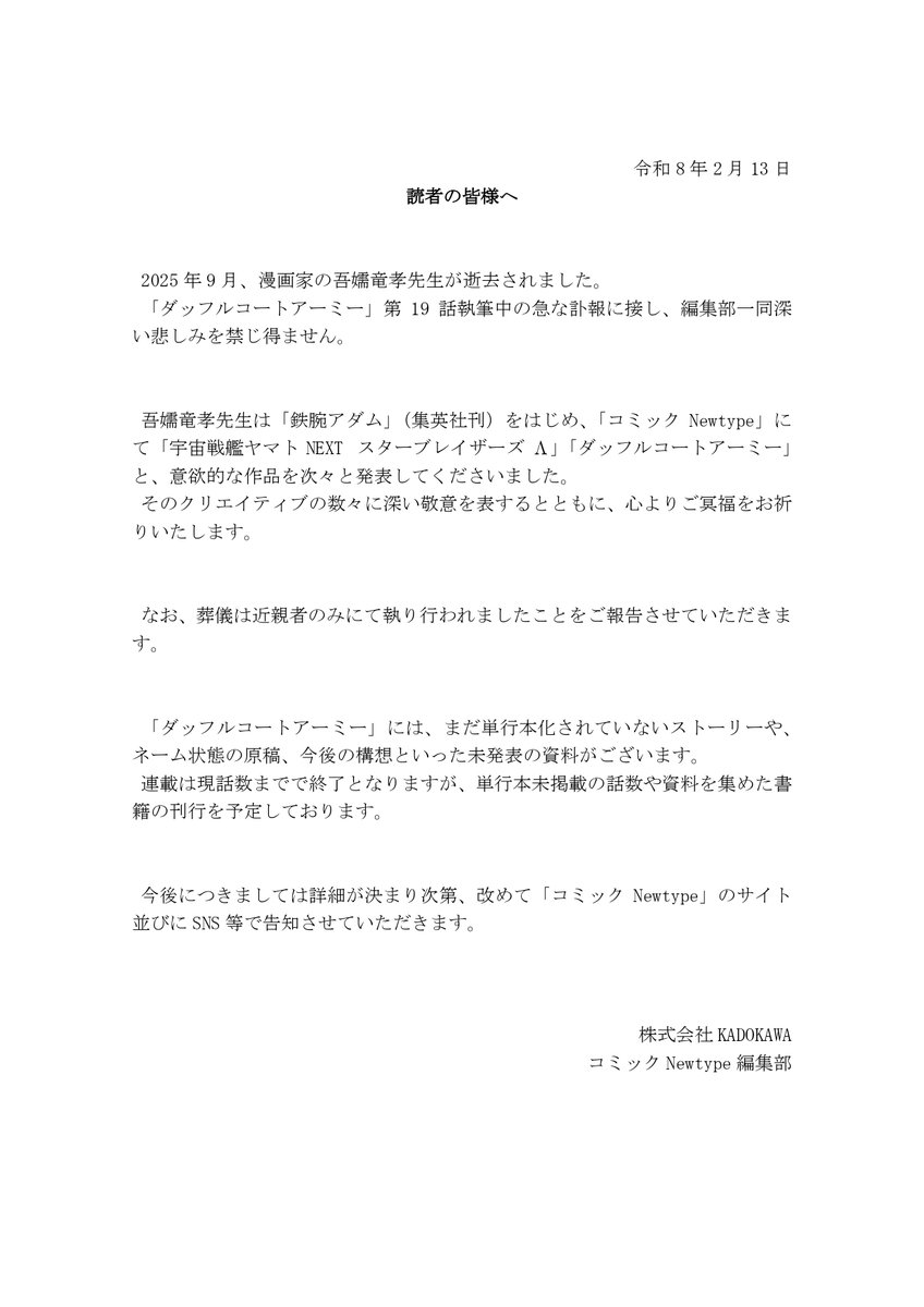 發布令人遺憾的消息,吾嬬竜孝先生於2025年9月創作「ダッフルコートアーミー」第19話時