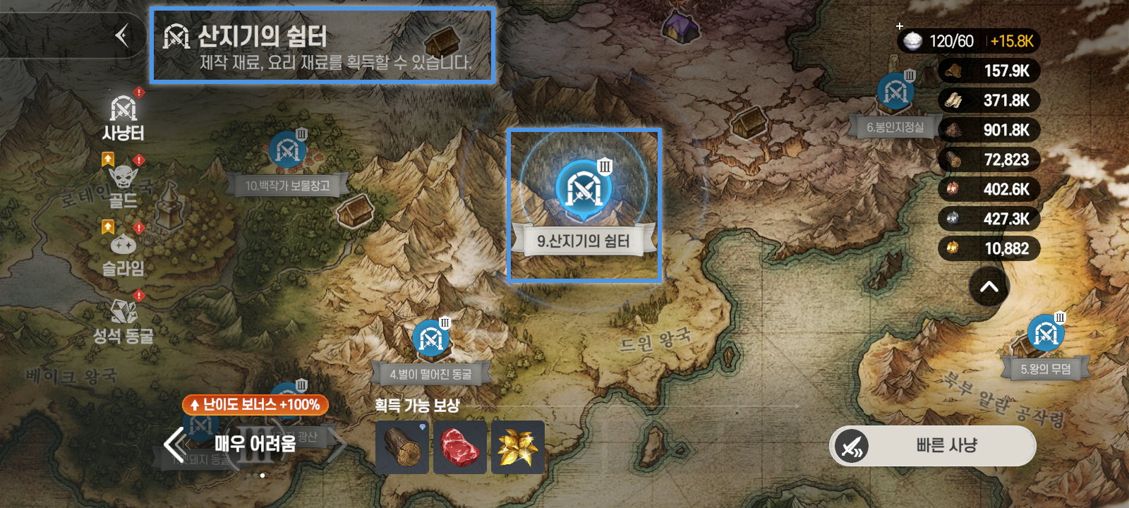 若進入狩獵場,將自動定位於最後獲得獎勵的場所
