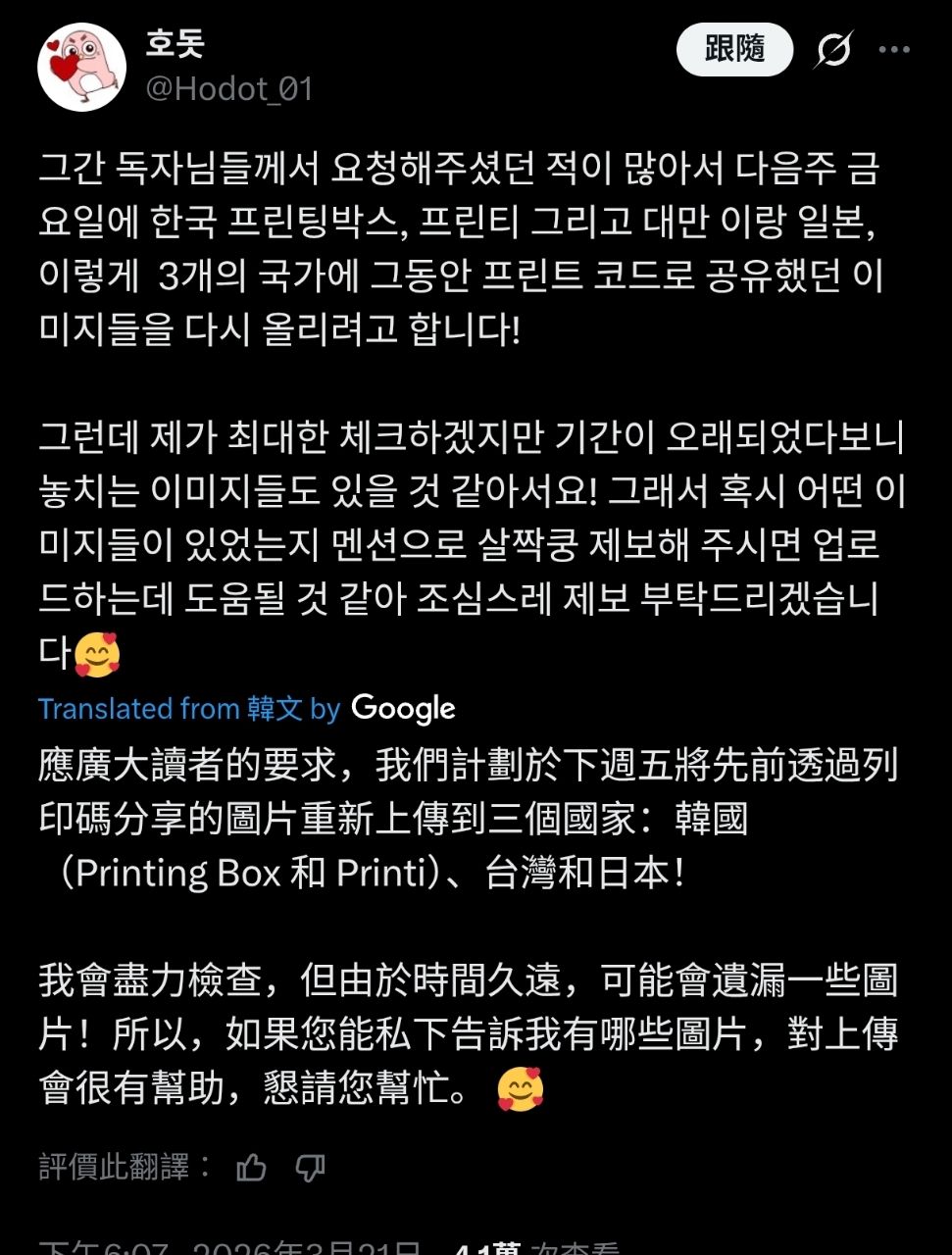 韓國漫畫家 Hodot在韓日台三國分別上傳