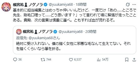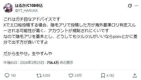 「這個算是蠻認真的建議,如果你在X上發色色插圖的話,有畫陰毛的版本,比較有機會