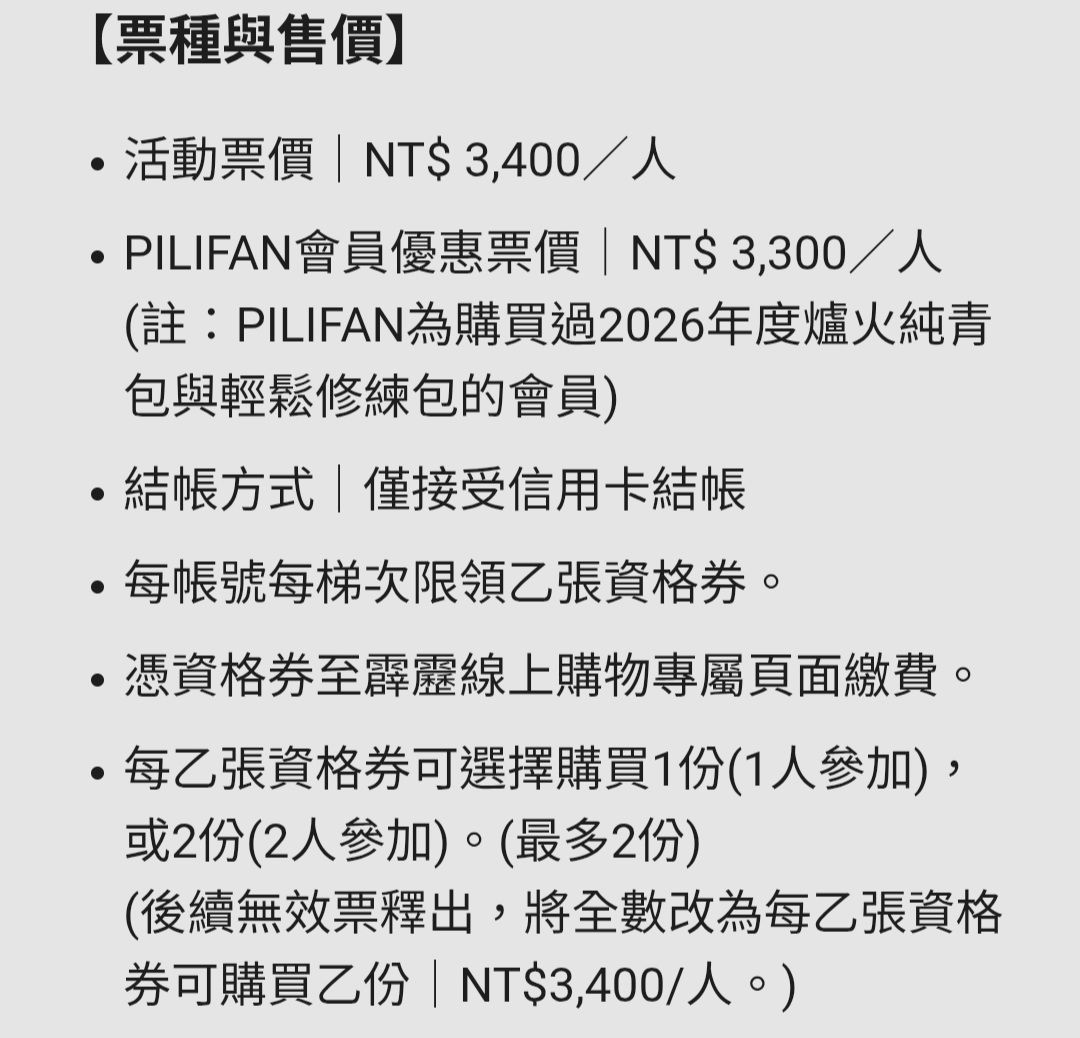 乙張資格券可選擇1人參加(購買1份)、或2人參加(購買2份)。票券不可轉讓。
