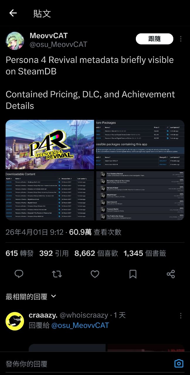 昨天歐美有人在steamdb上查到P4R好像有非常短暫的出現了一下子