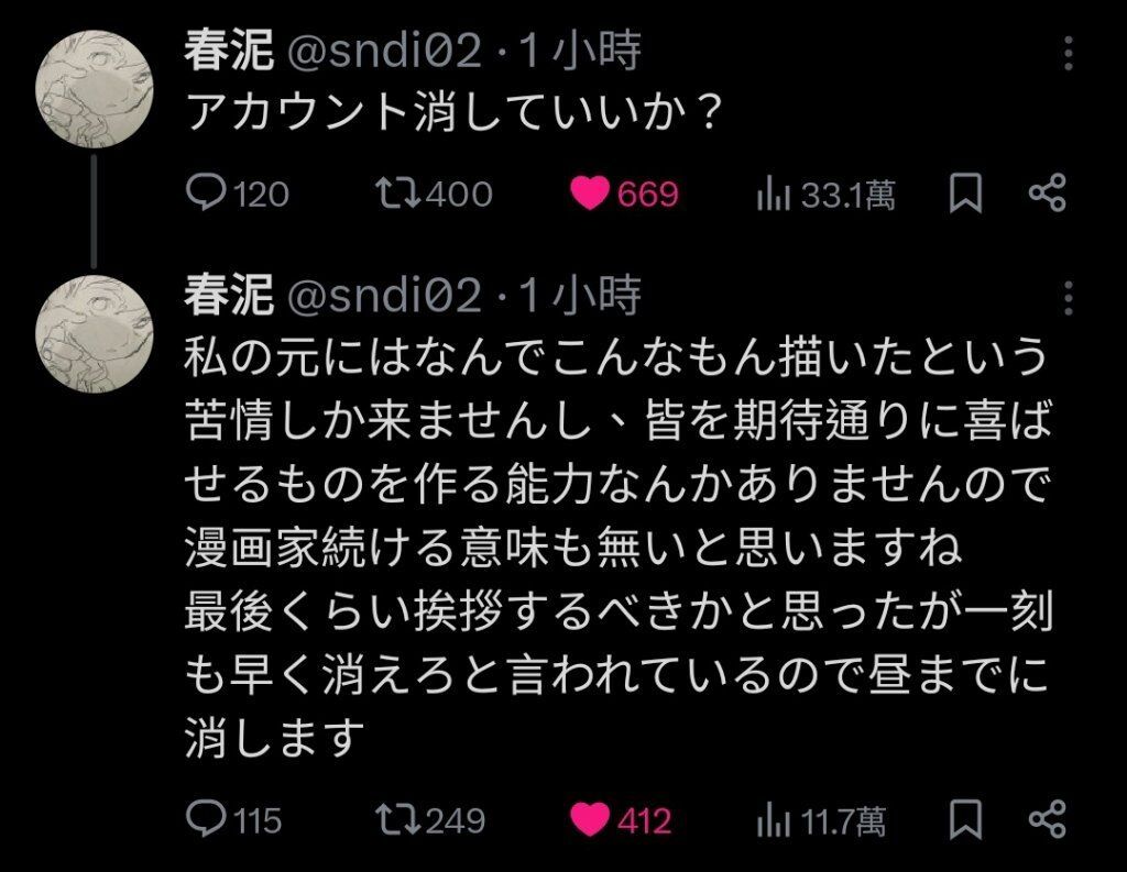4/12這天春泥老師在中午時刪除了推特帳號
