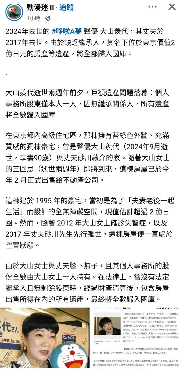 [新聞] 哆啦聲優大山羨代 鉅額遺產歸國庫