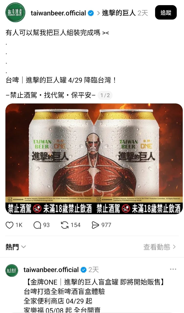 [情報] 台啤聯名進擊的巨人 盲盒啤酒