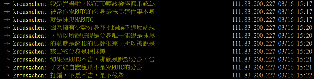 → krousxchen: 只要有個ID認同我的論點,你就在那邊說是我的分身 03/15 23:49