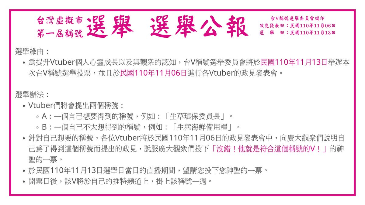 ●為提升Vtuber個人心靈成長以及與觀衆的認知,台V稱號選舉委員會將於民國110年