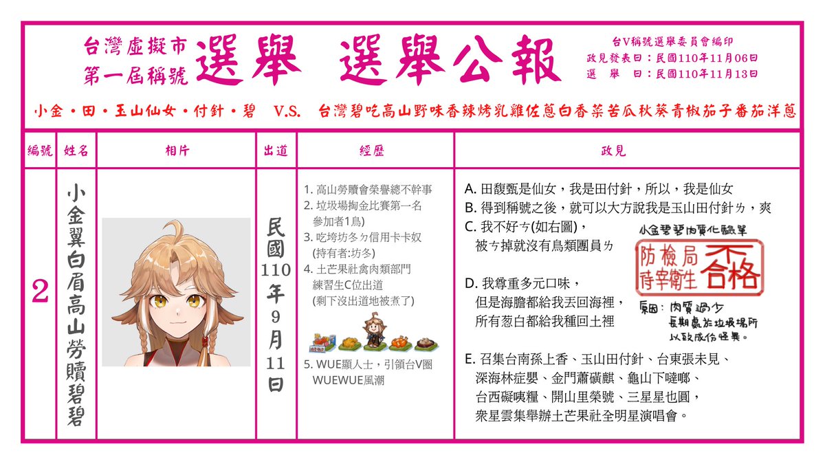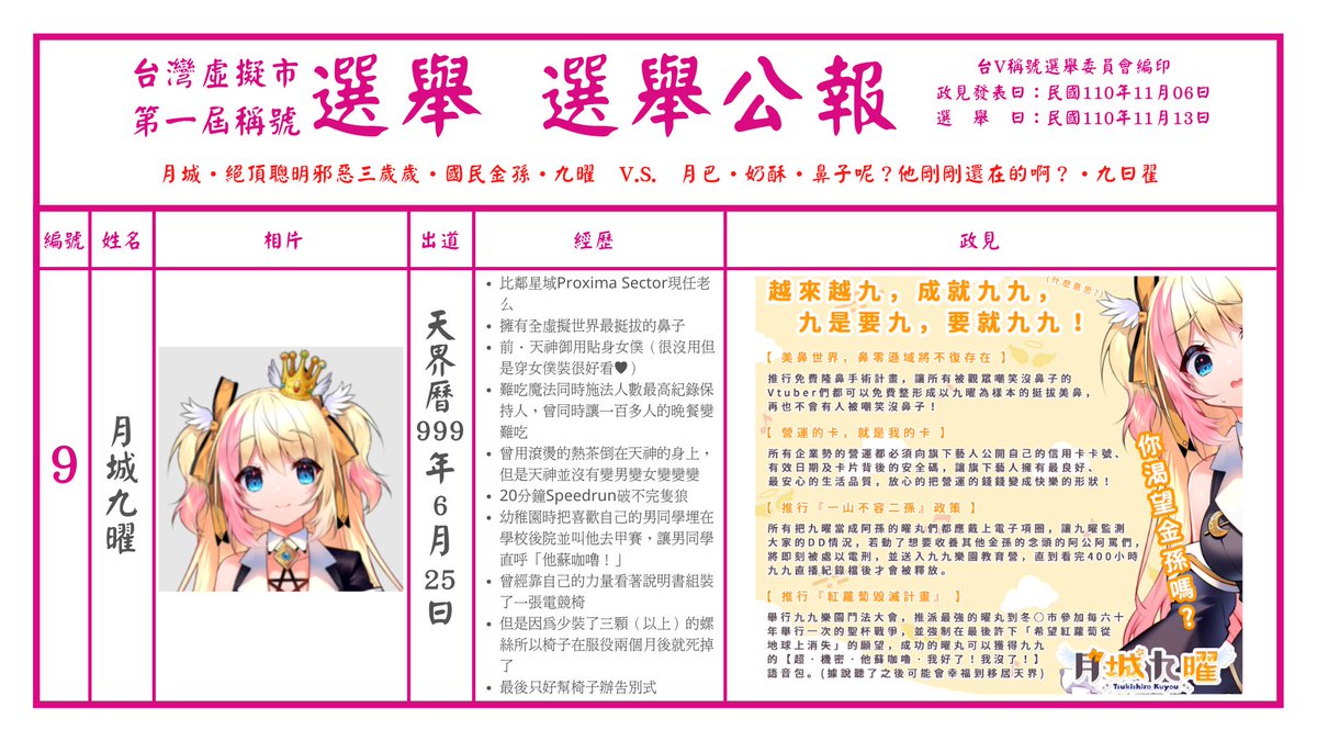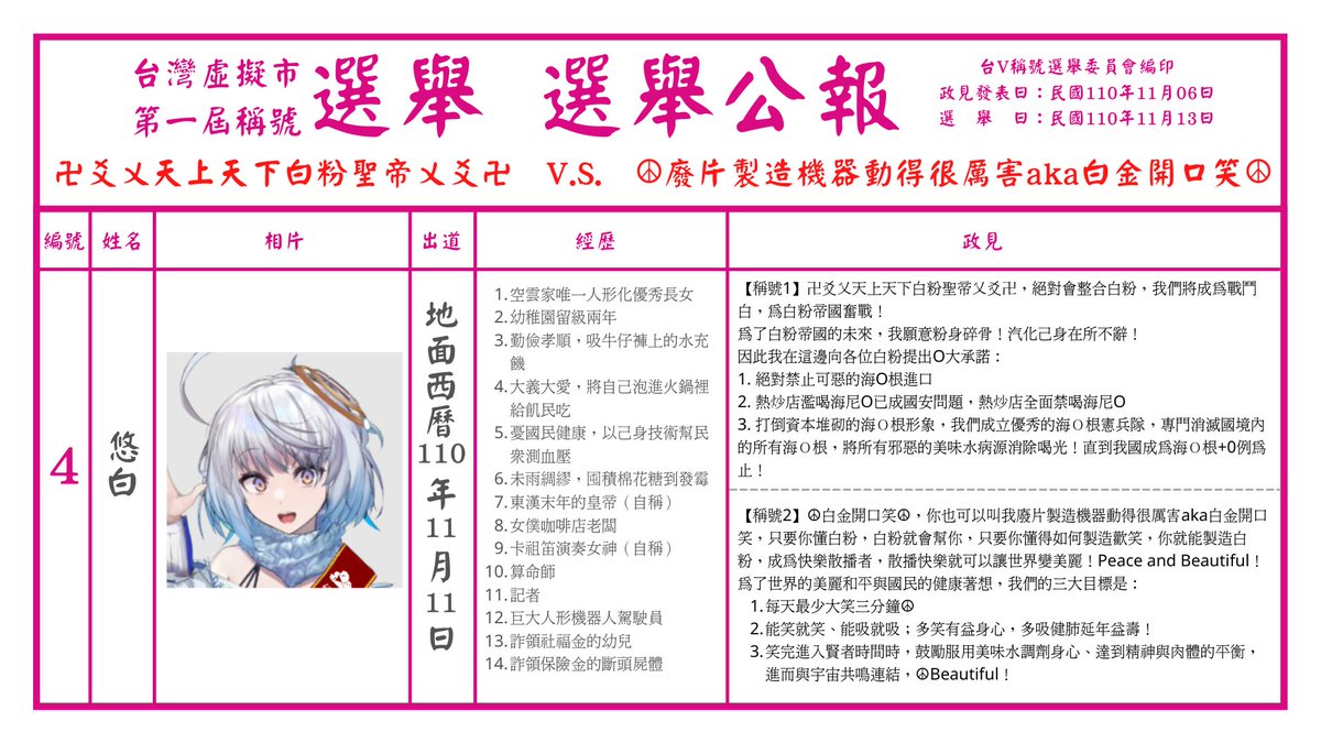 ●針對自己想得到的稱號,各位Vtuber將於民國110年11月06日的政見發表會中