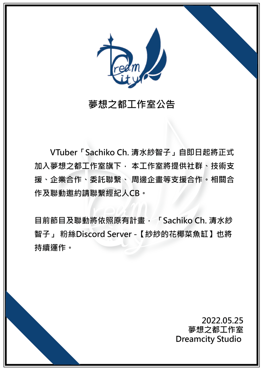 VTuber「Sachiko Ch. 清水紗智子」自即日起將正式加入夢想之都工作室旗下,本工作室