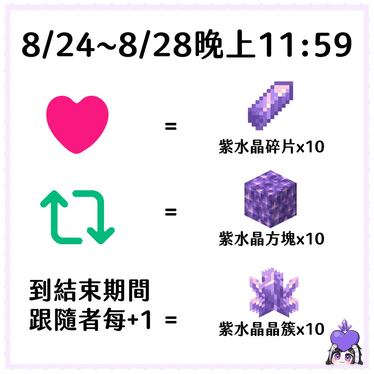 總數超過1000個會開放大家在麥塊裡斗內紫水晶(?